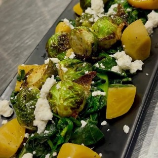 Price range: $17.99 through $26.99Gluten friendly. Warm crispy brussel sprouts, steamed golden beets with wilted hand harvest baby spinach and fresh tuscan kale. Crowned with feta cheese, tossed in honey Dijon vinaigrette dressing